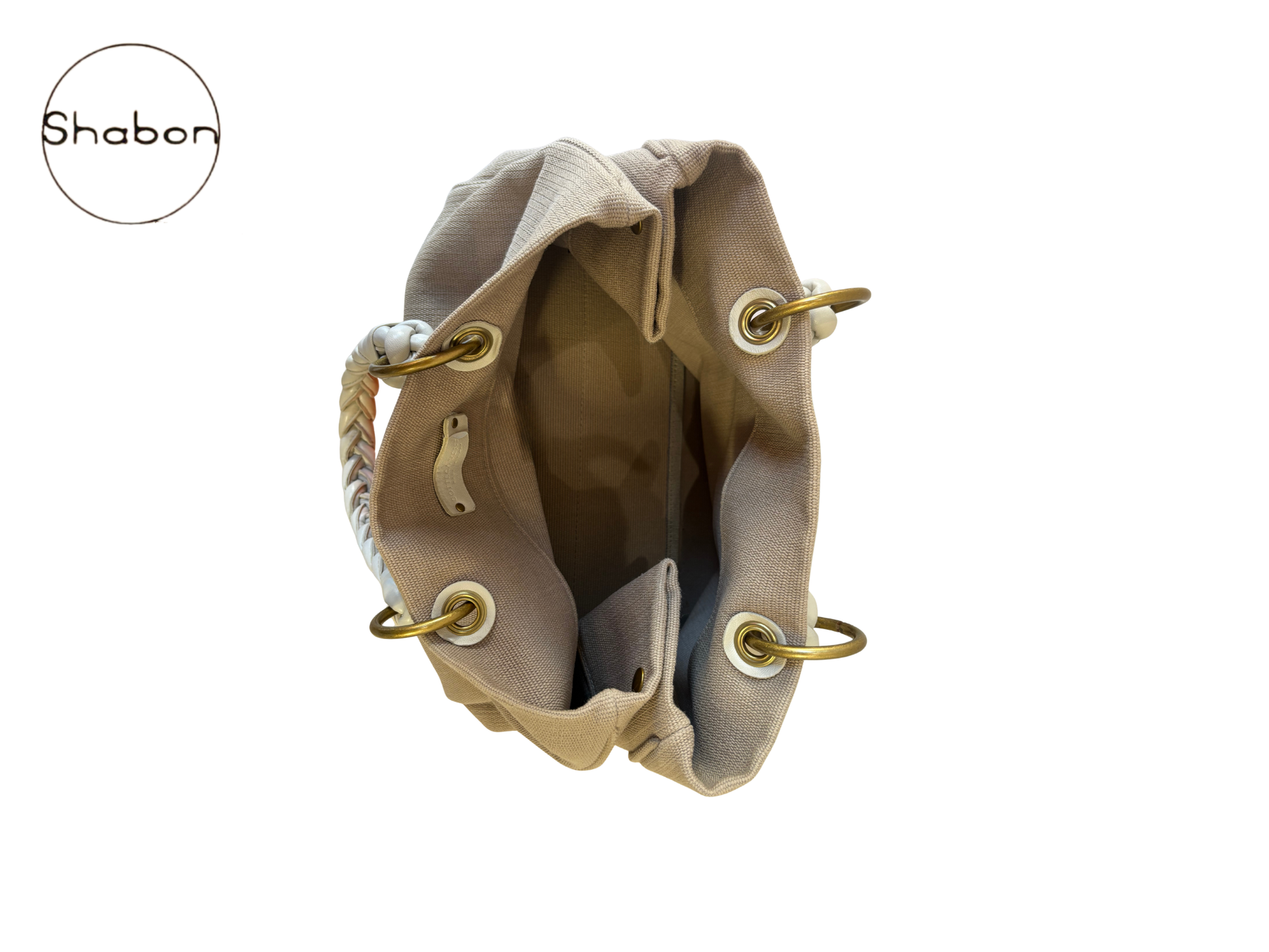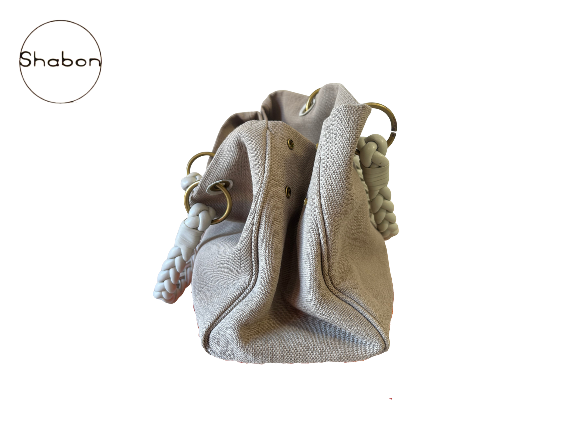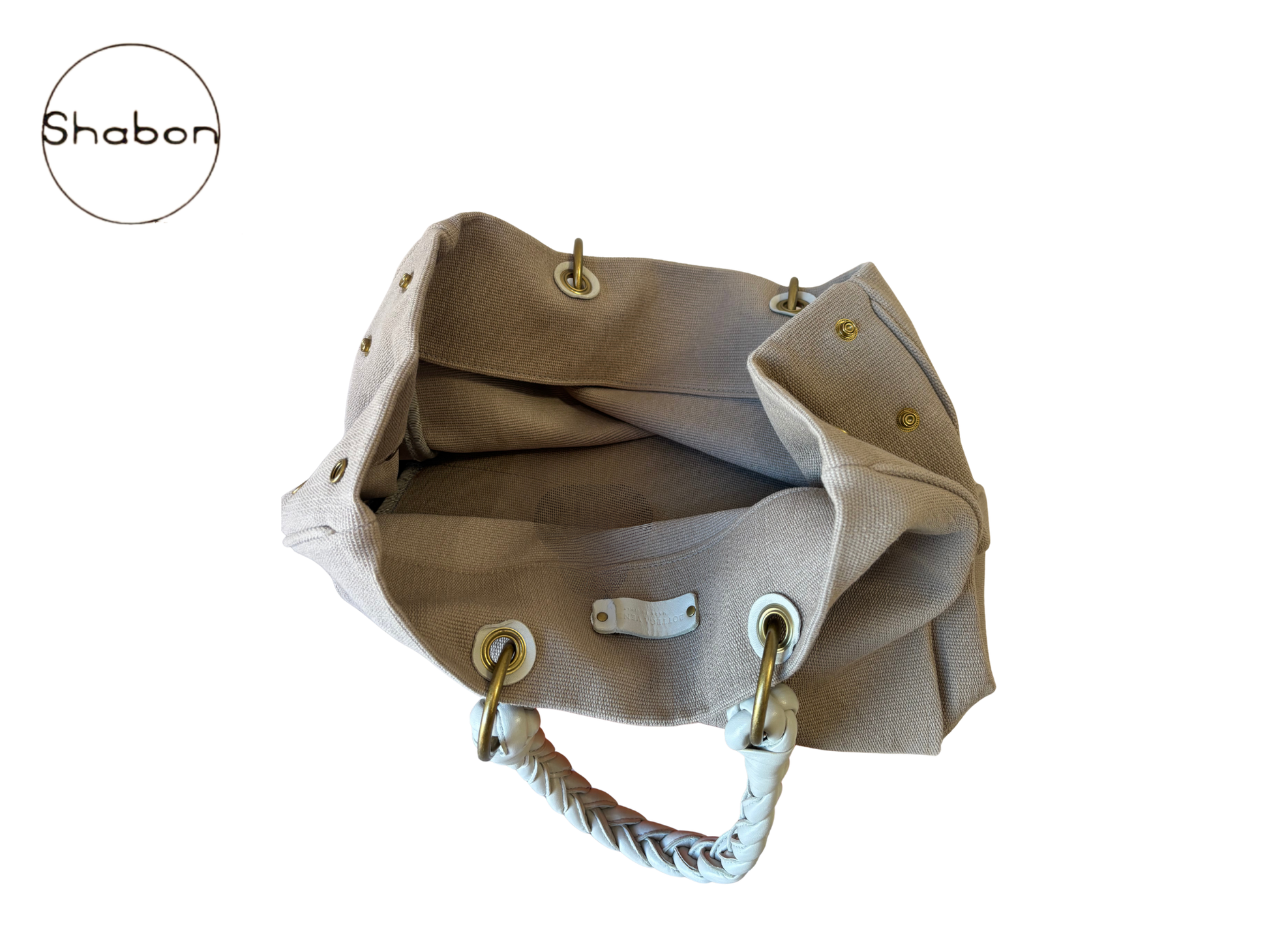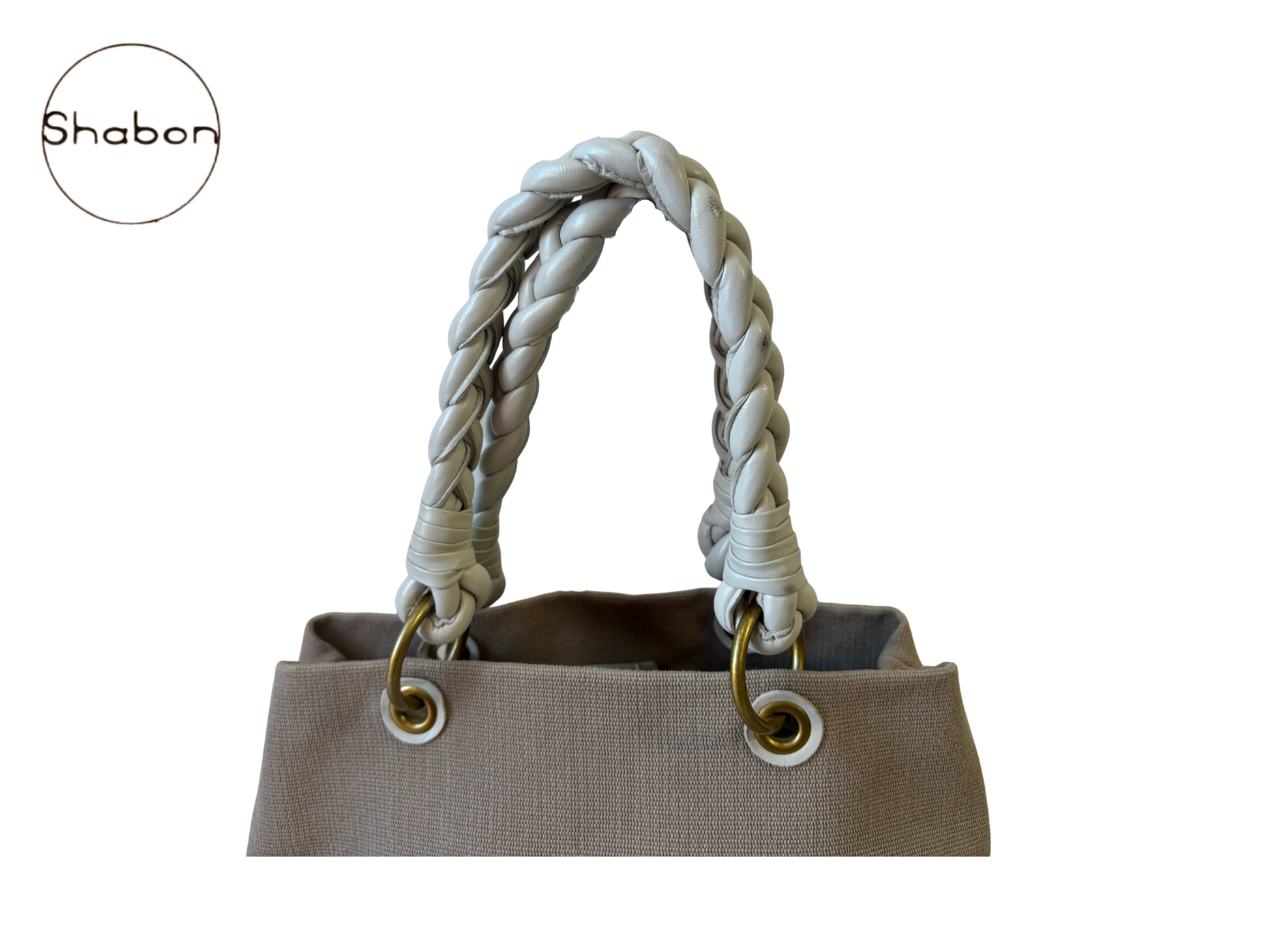 Vintage Bottega Veneta Cabat-style tote crafted in durable neutral canvas with signature braided leather top handles. Features brass-tone grommet hardware and a spacious open interior. A minimalist, timeless design showcasing Bottega Veneta’s renowned craftsmanship and understated luxury.