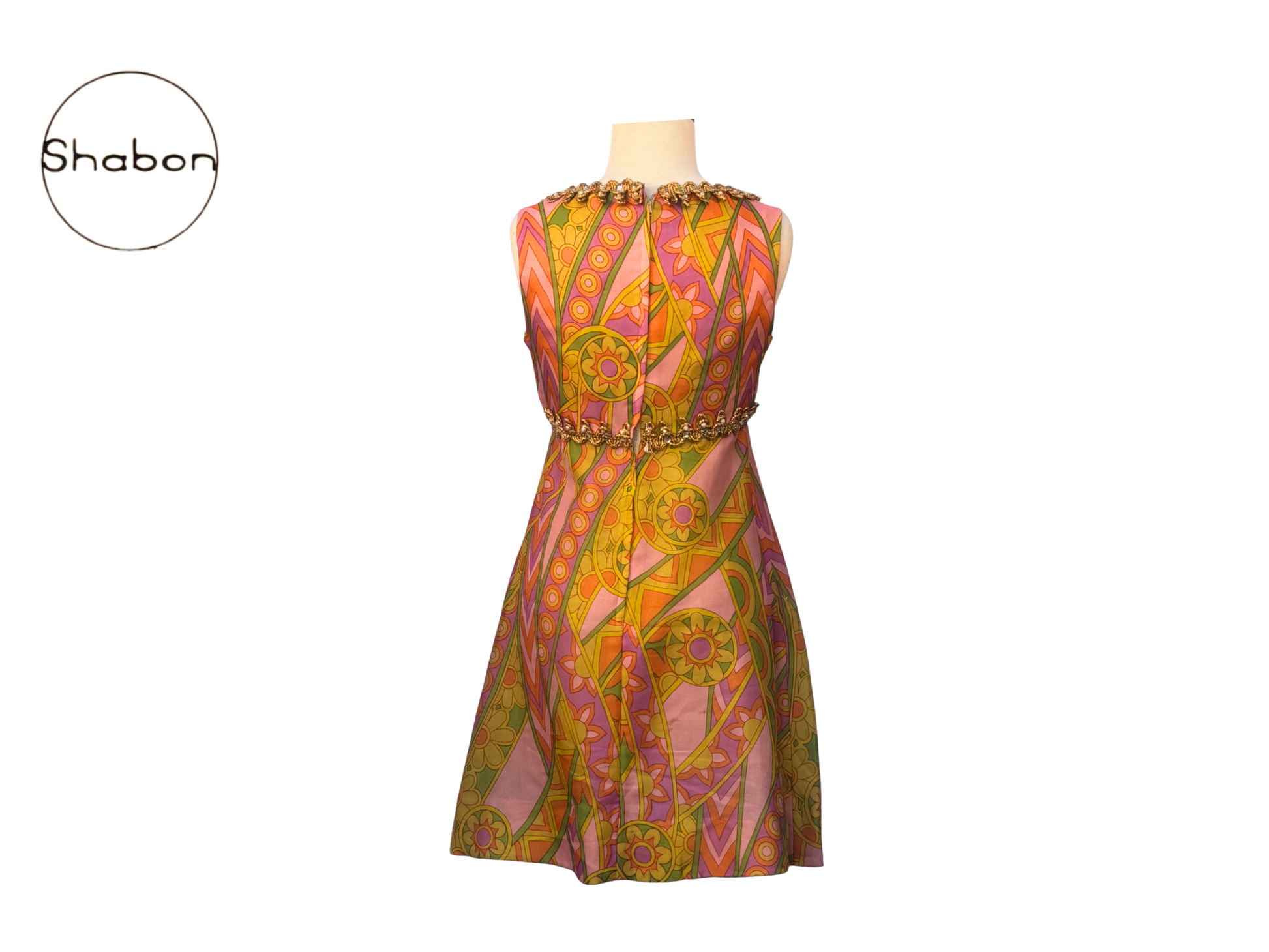 1960s mini dress featuring vibrant psychedelic prints in pink, orange, and green. Crafted in a silk-like fabric with a beautiful fluid drape, this piece is finished with an ornate gold beaded trim along the neckline and waist. A true vintage statement with incredible craftsmanship.