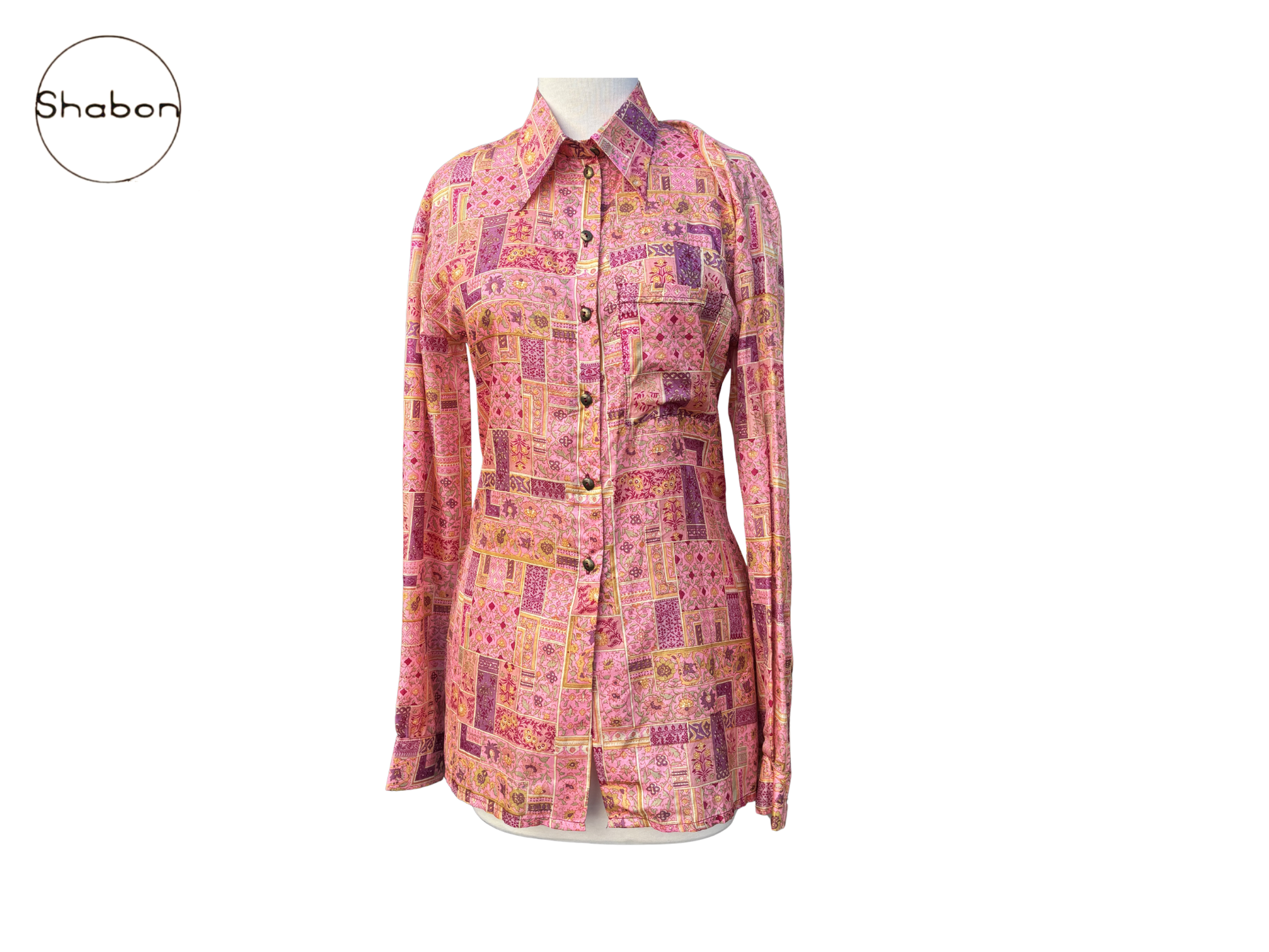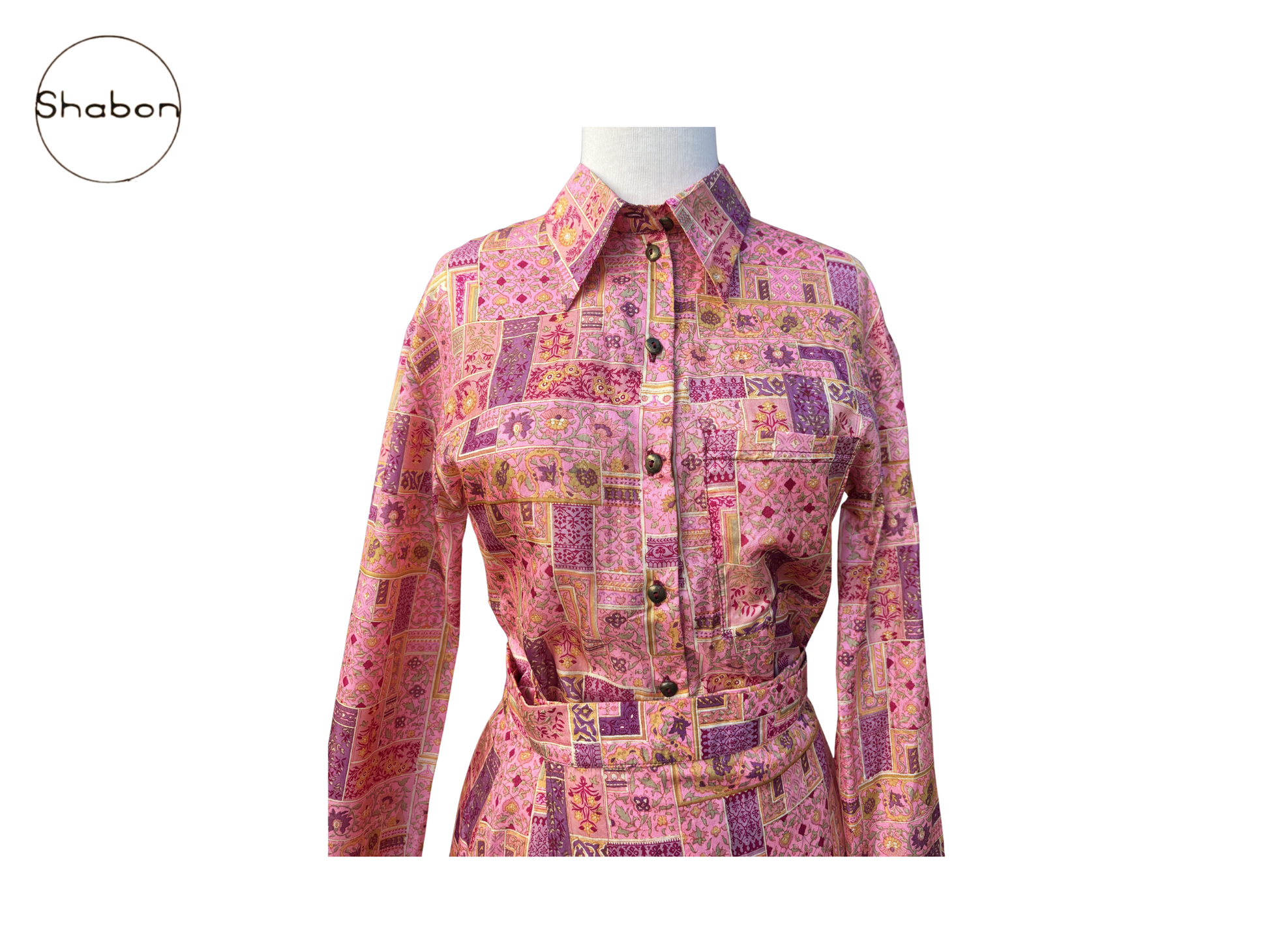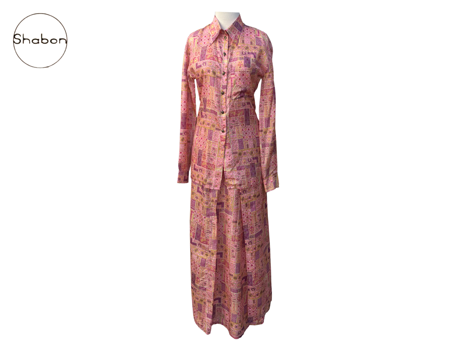 An original vintage Isabel Marant two-piece silk set featuring a long sleeve button-down blouse and matching wrap skirt in a vibrant pink and purple patchwork print.
