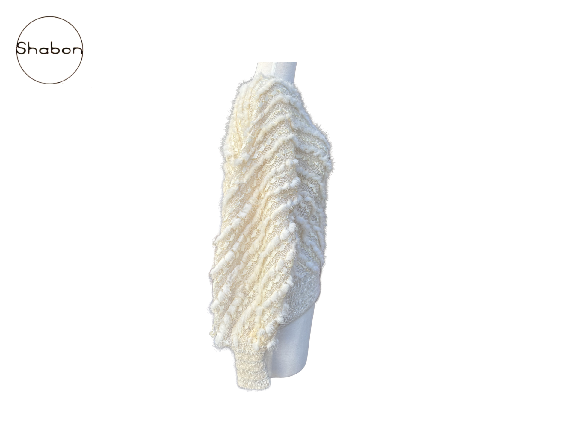 A rare vintage handmade knit sweater in a soft cream tone featuring dramatic diagonal rib detailing and dimensional fur accents throughout.