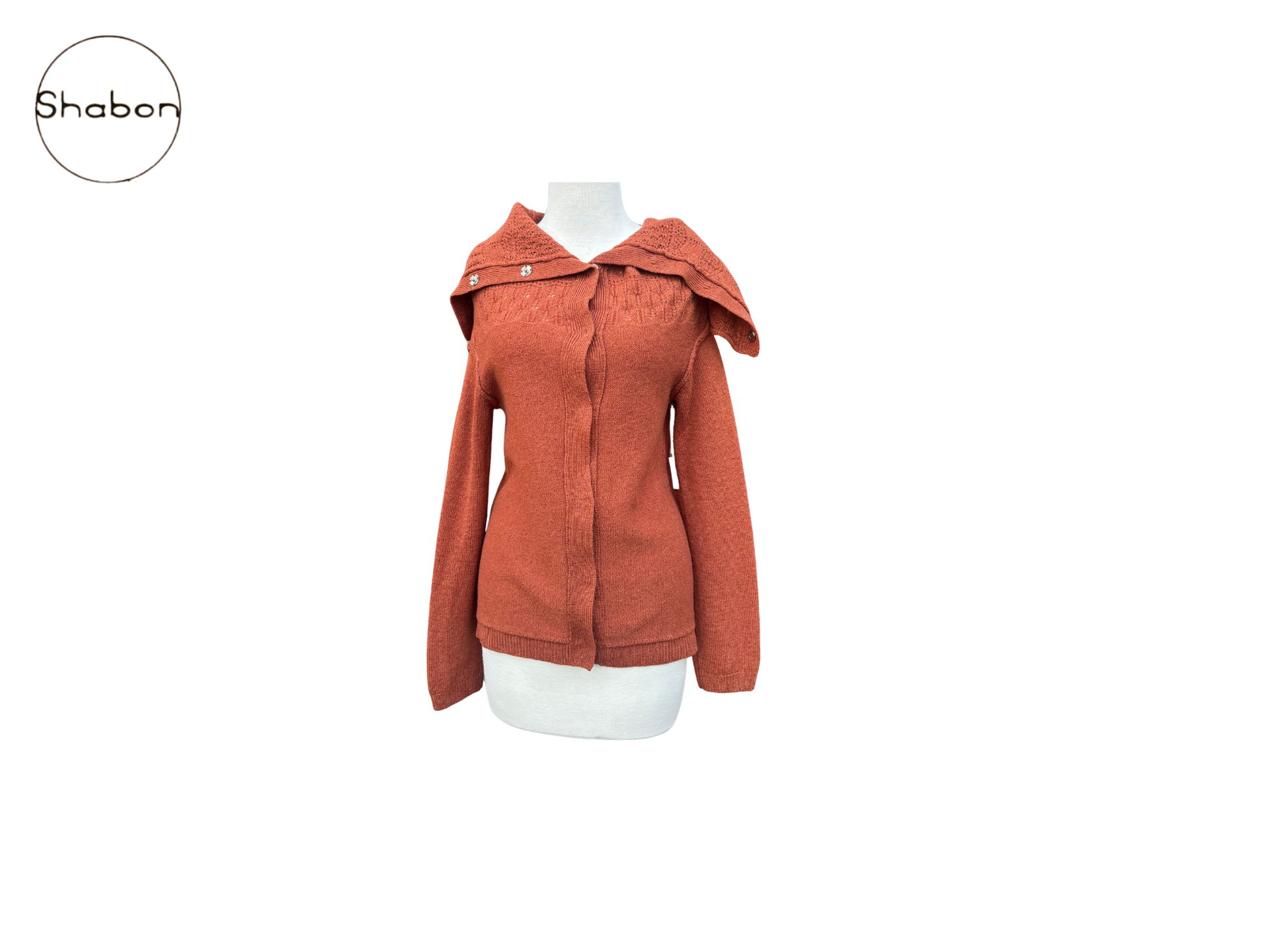 A 100% wool knit cardigan from Ys Yohji Yamamoto in a rich rust brown tone. Features a structured silhouette with a layered collar detail and front button closure. Made in Japan.